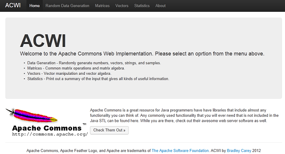 If you are a Java developer then you are very familiar with The Apache Commons. This web app is just basically a web implementation of the commons’ Math library. Here is an excerpt from the Commons’ website about Commons Math: