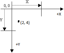 In the above diagram: up is +Y, down is -Y, right is +X, and left and -X. Windows uses a modified version of this. Basically the Y axis is flipped: up is -Y, down is +Y, right is +X, left is -X. Here is a diagram to further illustrate this: